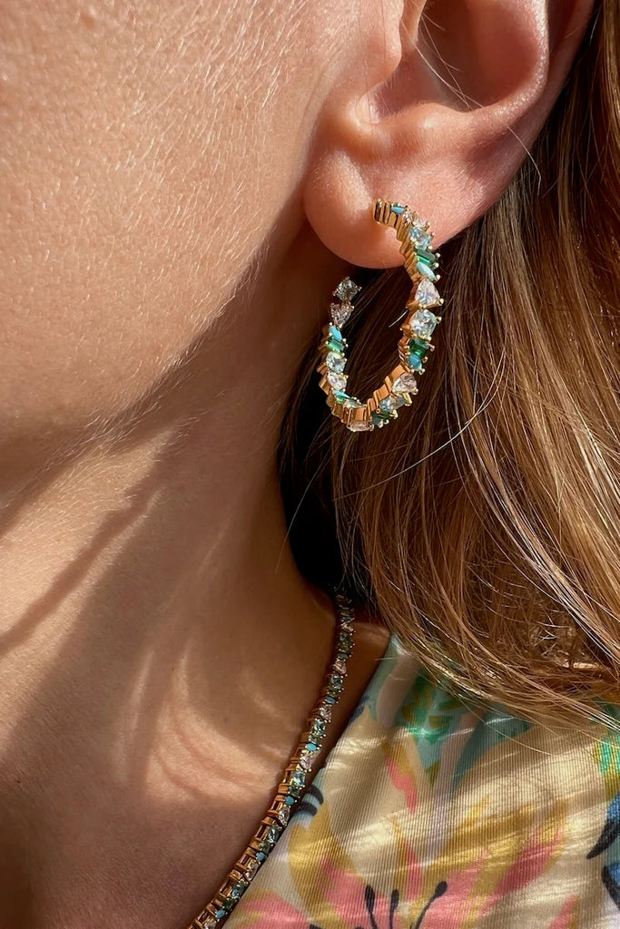 Dazzle in dreamy shades of turquoise and teal opal with these stunning 14K gold vermeil hoop earrings. Featuring multi-cut cubic zirconia stones—marquis, baguette, and trillion cuts—paired with vibrant opal and turquoise hues, this piece blends elegance with modern charm. Measuring 2 inches.
