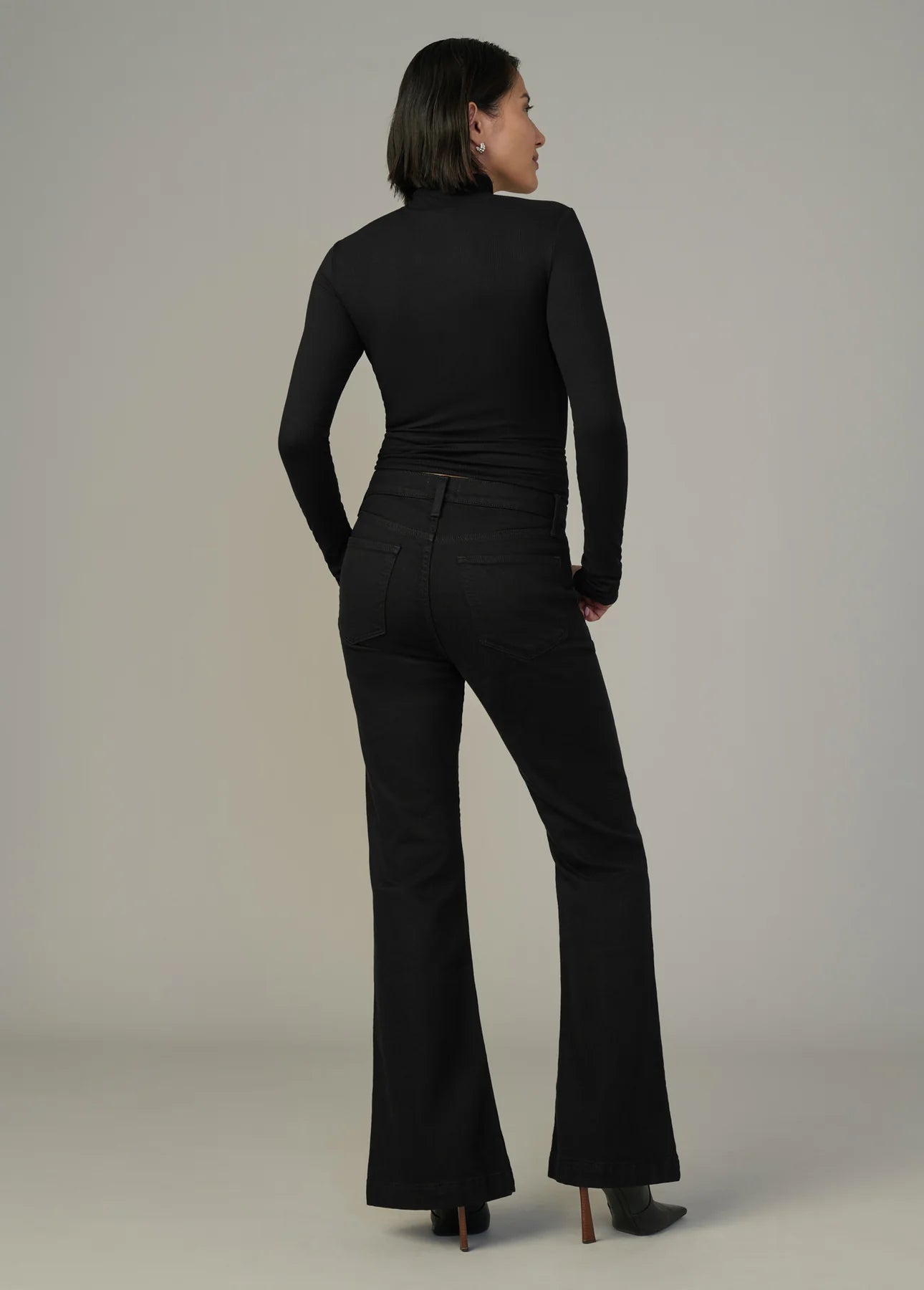 A high rise and slim fit through the waist and hip with a relaxed knee that breaks to a wide flare and is perfectly proportioned for 5'4" and under.