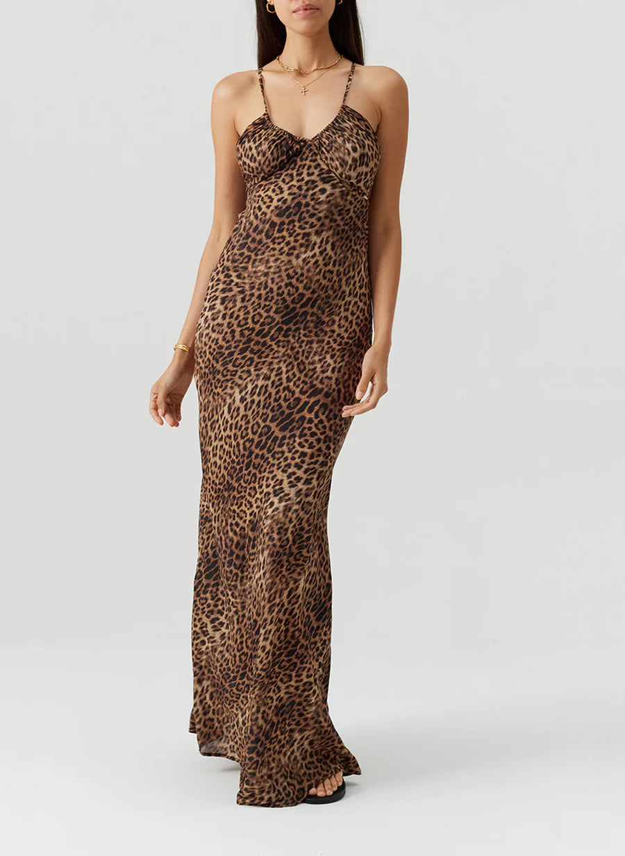 Unleash your wild side with the Jacey Dress in bold Cheetah print. This effortlessly elegant maxi features a flattering V-neckline and delicate thin straps that can be crossed at the front or back, offering versatile, flattering styling options. A striking open back cut-out adds a touch of daring sophistication, perfectly balancing fierce with feminine.