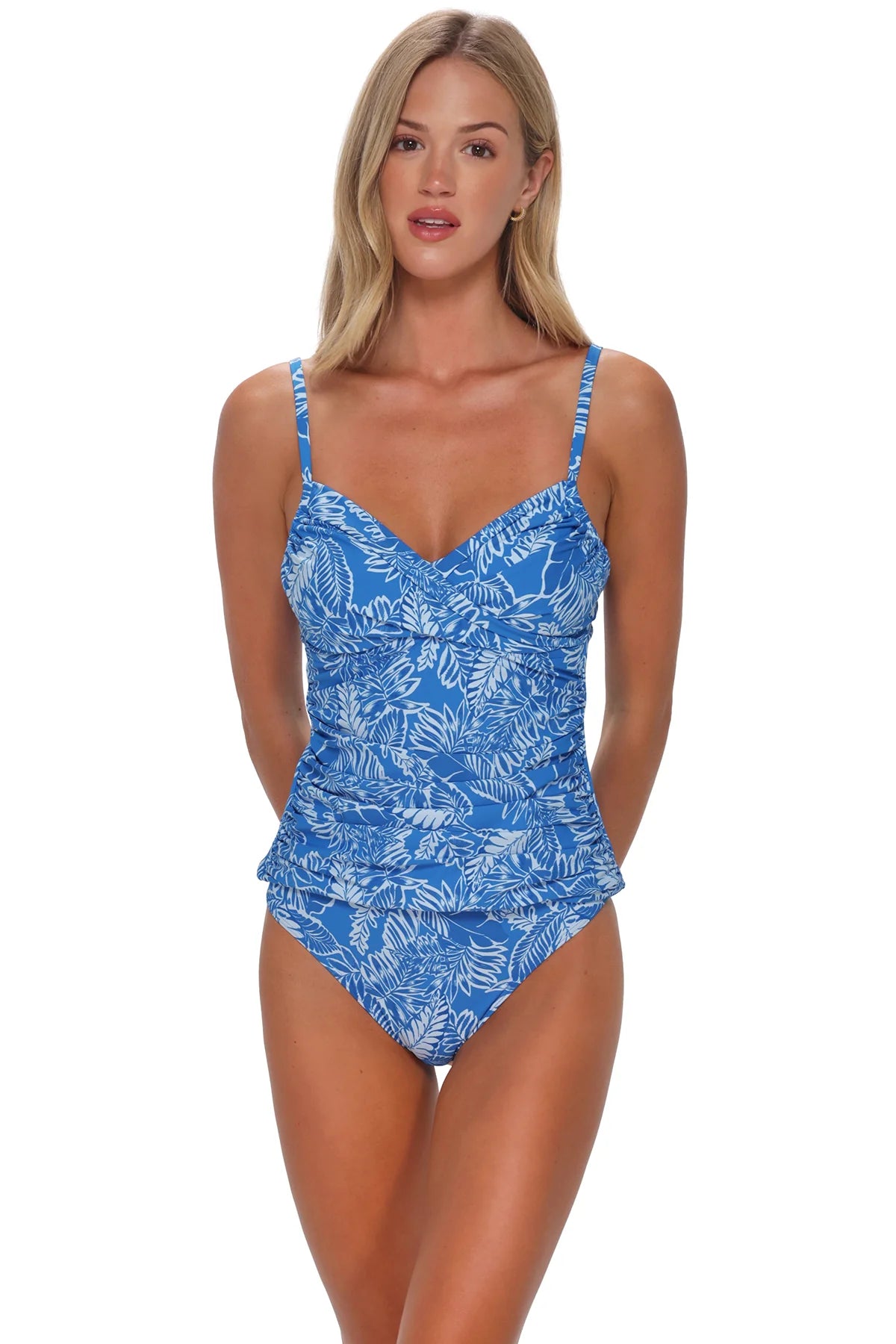 The Simone Tankini is sleek and sophisticated. With shirring along the sides and a flattering crossover neckline, this tank is a summer staple! Features include removable cups and over-the-shoulder adjustable straps that can be converted to a crossback.
