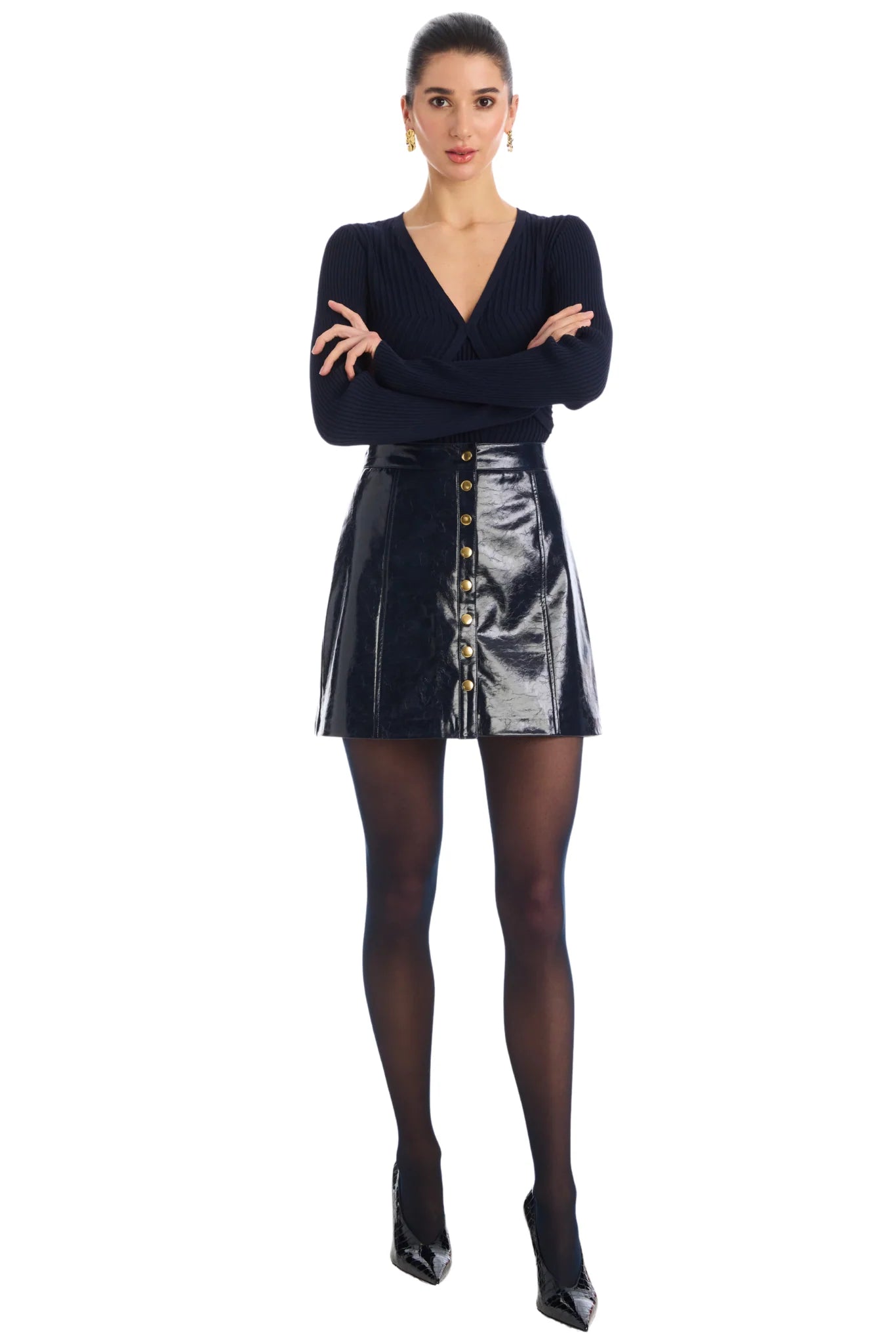 The Haley Knit Top in a rich midnight navy hue features a slim fit through the body and sleeves in a lightweight viscose yarn, perfect for all year. Designed with a V neckline; perfect to tuck into the Carla mini skirt or your favorite denim.