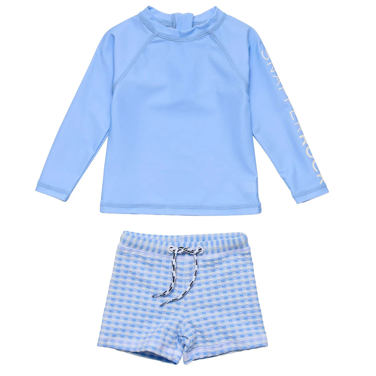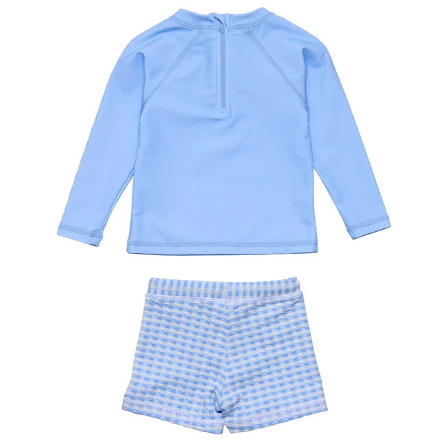 Ready for beach days, pool play, and plenty of splash time. The Seaside Blue LS Set includes a long sleeve rash top in solid blue with subtle Snapper Rock logo print on the sleeve and zip back neck for easy on-off, paired with textured gingham bottoms in soft stretch fabric. The shorts feature a comfy elastic waistband with a drawcord for a secure fit.