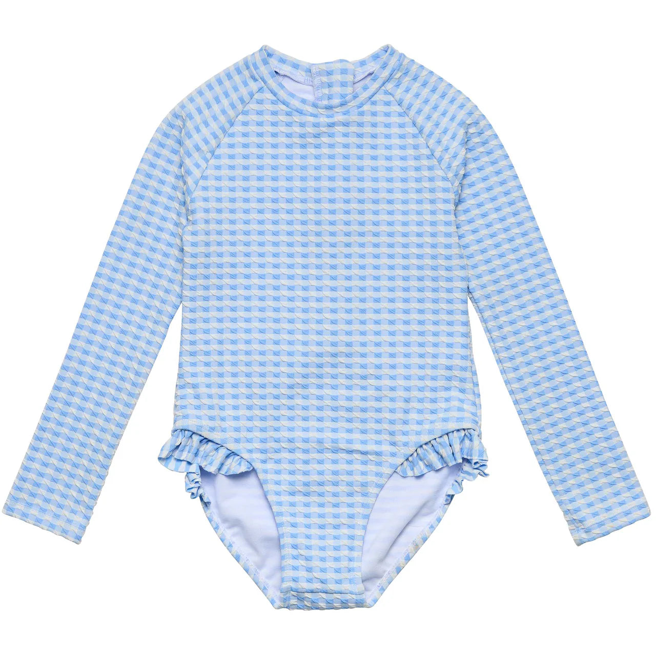A sweet spin on a surf classic. This long sleeve one-piece features our Seaside Textured Gingham with frilly leg detailing, a back zip for easy changes, and full UPF50+ sun protection built in.
