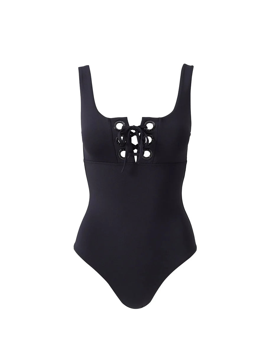 Make a striking impression in the London Black Swimsuit, where timeless elegance meets modern edge. This over-the-shoulder silhouette features a captivating lace-up eyelet detail at the chest, adding a touch of daring sophistication to a classic design. Crafted with removable pads for customizable support, the London sculpts and flatters your figure with ease.