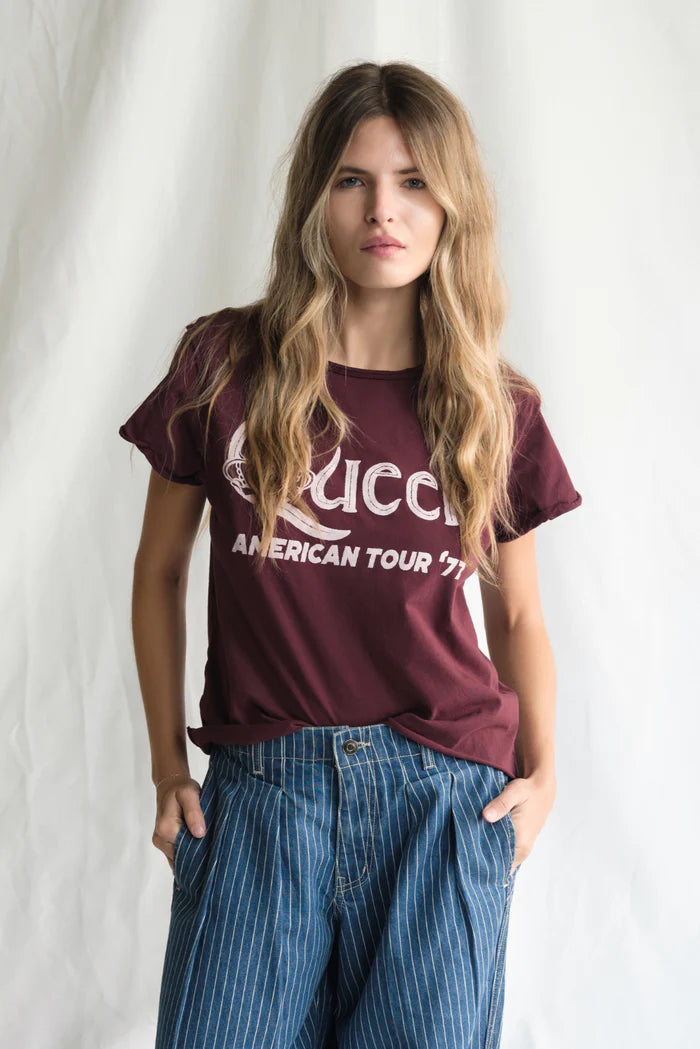 This isn't your average tour shirt. It's a statement. Crafted from a dark, wine-hued fabric that's as rich as a vintage cabernet, this cropped top is an ode to defiance. Featuring a '77 American Tour graphic, it has the raw, rebellious feel of a true concert find. The cut is intentionally daring- shorter and sharper-perfect for those who want to live like a rock star. Pair it with high-waisted denim and a glass of red. This top is for the unapologetic and the iconic.