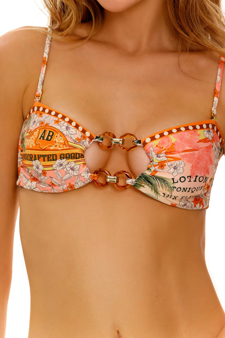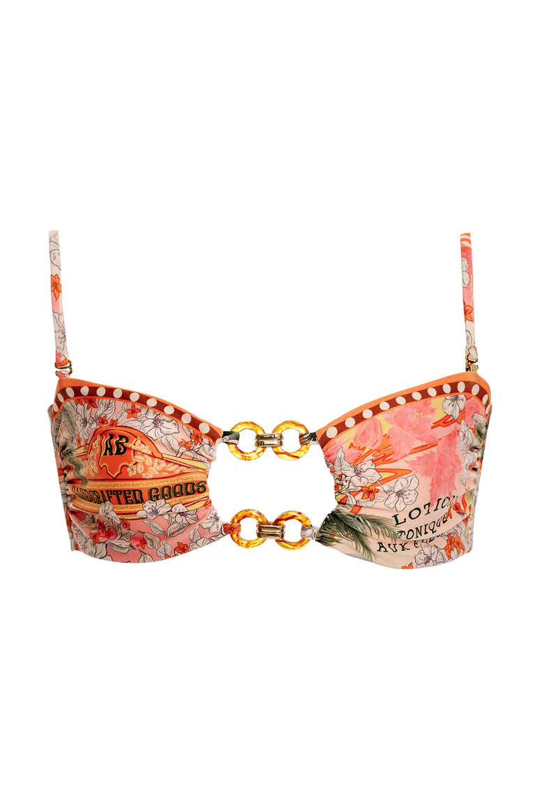 The Lace Bikini Top blends vintage-inspired charm with modern design. Featuring bold ring details and an adjustable fit, this piece offers versatility with removable straps. Its intricate print is inspired by antique French perfume labels, celebrating timeless elegance and craftsmanship
