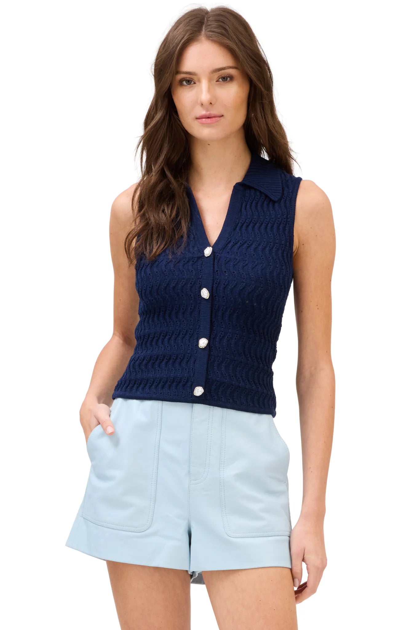 The best selling Bodhi Tank in 100% cotton is back in a classic navy hue. Designed with a wavy pointelle knit pattern with a deep v neckline and preppy collar. Faux irregular shaped pearl buttons at the center front. Very fitted through the body, so size up if you are in between sizes! We love this bra-friendly style all year!